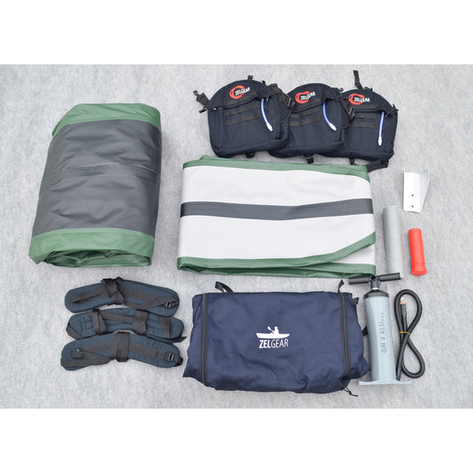 Das Zelgear Spark 520 wird mit drei Sitzen, drei Fußstützen und drei Paar Schenkelgurten geliefert. Mit der im Lieferumfang enthaltenen Doppelfinne kannst du die Richtungsstabilität und Manövrierfähigkeit des Zelgear Spark 520 verbessern. Zusätzlich bekommst du ein Reparaturset für kleinere Schäden, eine Luftpumpe und einen Transportsack. So kannst du dein Spark 520 ideal verstauen, pflegen und transportieren.