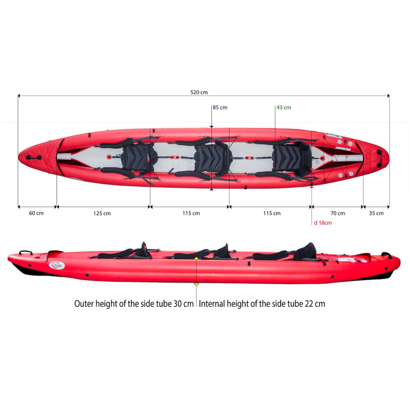 Die UV-beständigen PVC-Seitenkammern mit 0,25 bar Betriebsdruck sind abriebfest und für regelmäßige Nutzung auf Seen und Flüssen konzipiert. Ein großer Vorteil ist der herausnehmbare Dropstitch-Boden, der bei Bedarf jederzeit ausgetauscht werden kann – ein entscheidender Faktor für die lange Lebensdauer dieses besonders großen Tourenkajaks.
